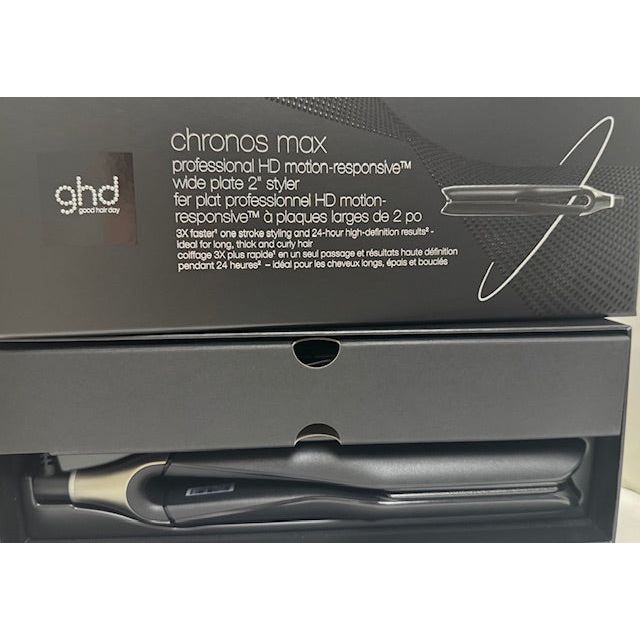 Equipped with advanced motion-responsive HD technology and featuring 85% wider, close-edged plates, GHD Chronos Max guarantees up to 3 times faster styling in a single pass, with HD results that last for 24 hours. This styler works quickly on large sections of hair, delivering up to 3 times smoother finish and 90% more shine. Thanks to its innovative plates, it also ensures optimum access to the roots for impeccable results from root to tip. Ideal for long, thick and curly hair. Optimum temperature up to 365°F (185°C) and universal tension. 2-year warranty.