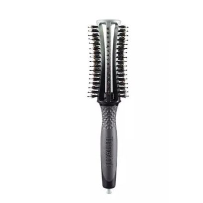 Thermovent Combo Brush - Olivia Garden's ThermoVent Combo Brush creates soft waves, adds volume or straightens your hair. Benefits Superior airflow reduces drying time Avoid damage from over-drying Curved barrel gets closer to the scalp creating longer lasting shape Hydrate the cuticle & add shine Create soft waves, add volume or straighten hair Lightweight & comfortable Eliminates frizz & flyaways Anti-static Features 2" diameter Alternating rows of 100% boar & ionic bristles Ventilated barrel design allows heat & cool shot to reach inside of brush head Scalp-hugging barrel Retractable sectioning pick Ergonomic handle shaped to easily rotate - Thermovent Combo Brush.