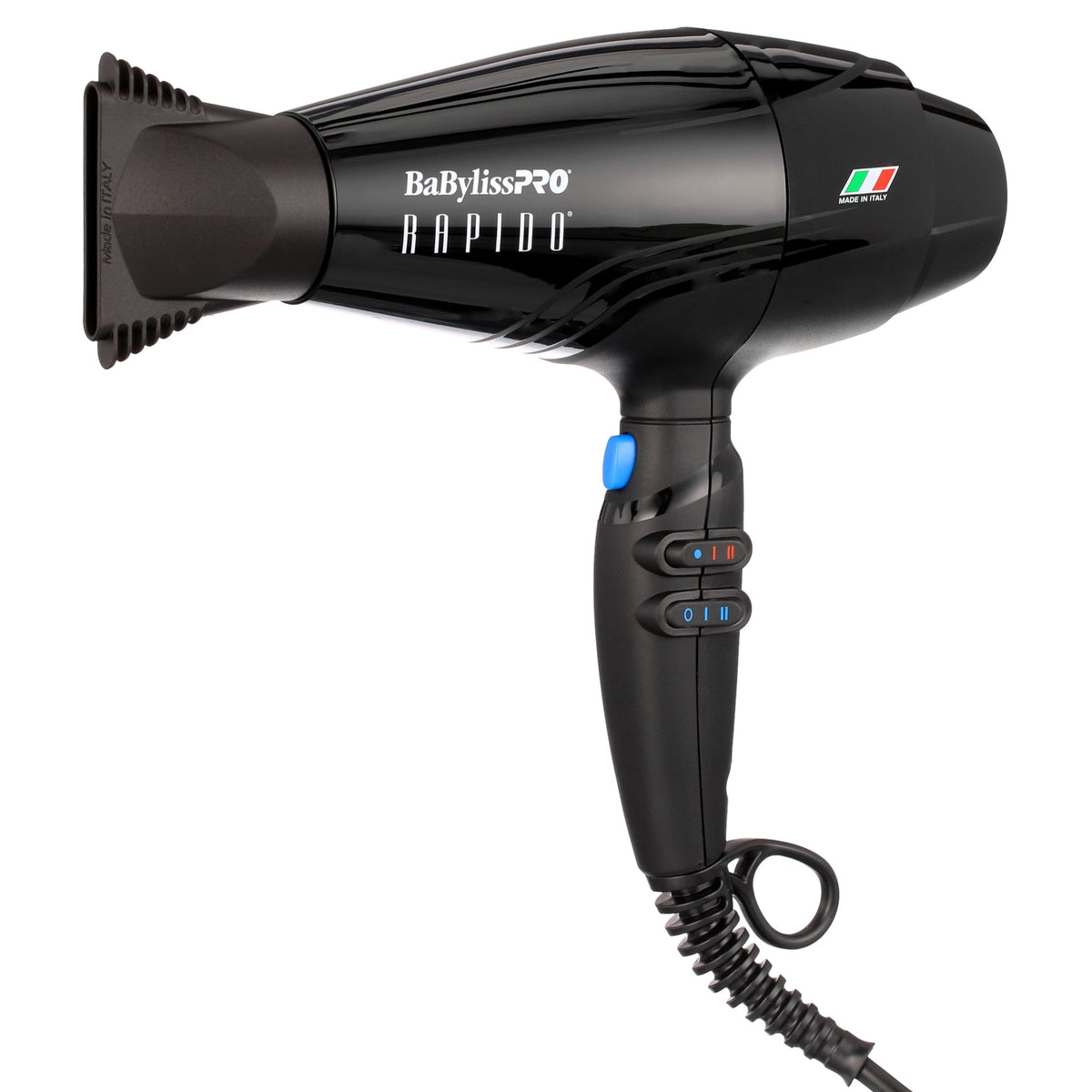 BabylissPro Rapido Blow Dryer (Black)..Nano Titanium Heat Technology, 2000 Watts, 6 heat/speed settings, cold shot button, 3 snap-in concentrator nozzles, drawstring pouch..