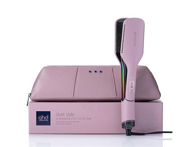 Revolutionize your hair routine with the ghd Duet Style professional 2-in-1 hot air styler, part of the limited edition Futurescape collection. Designed in a captivating transcendent pink finish with dazzling iridescent accents, this game-changing tool blends cutting-edge technology with sleek design. Complete with a matching heat-resistant bag and mat, it’s the ultimate companion for effortless styling.